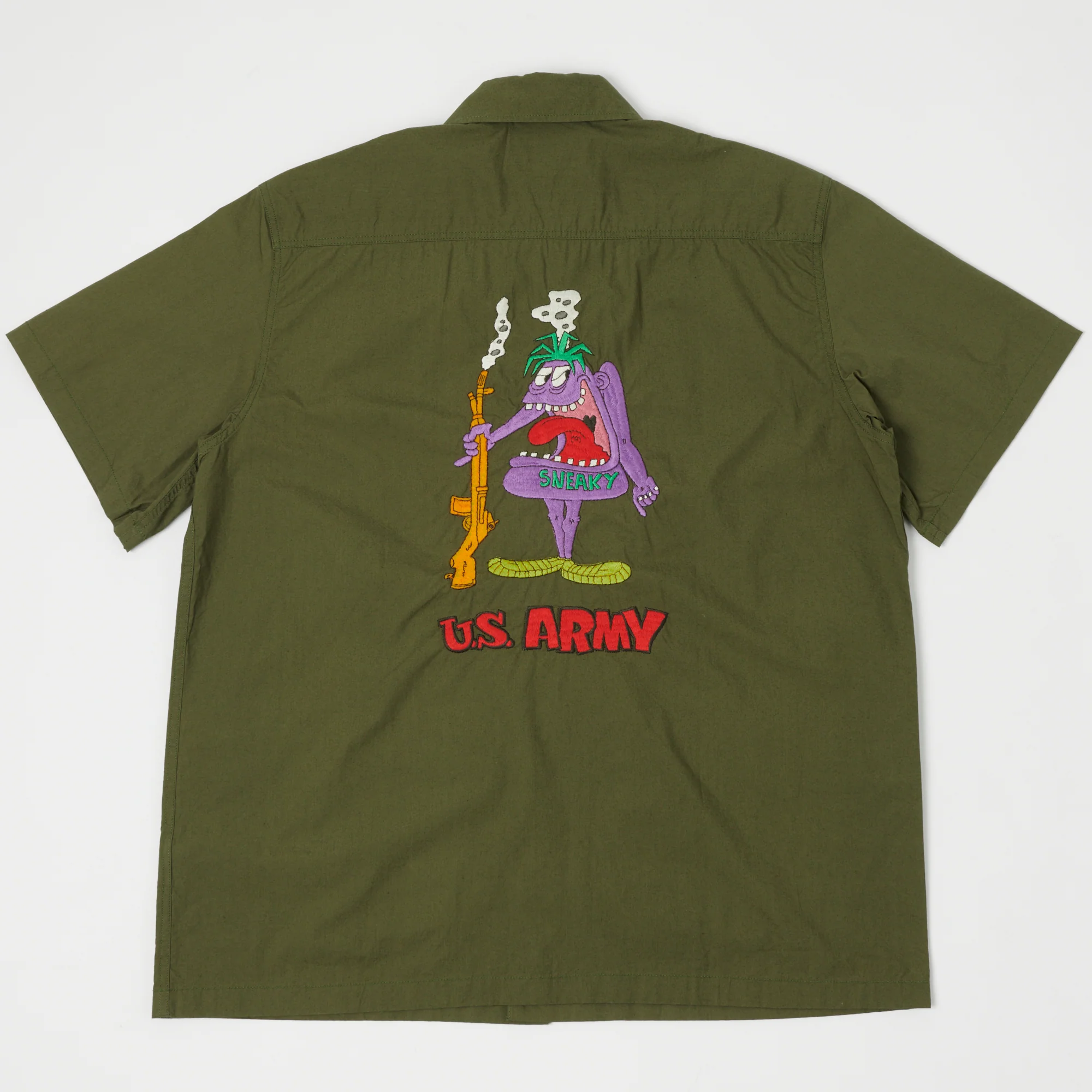 This simple shirt has a standard shape and is cut from 100% cotton which is durable and soft. The sleeves have been cut short which makes this option perfect for the summer months. Two large pleated pockets have been added to the front in a tiger stripe camo, whilst the most obvious customisation is on the back. A gun wielding purple character adorns the back with ‘U.S Army’ scrawled in red bubble writing underneath. Meanwhile, the left chest is embroidered with the name ‘Billy’. This shirt boasts double felled seams throughout which are a signature of quality and durability.